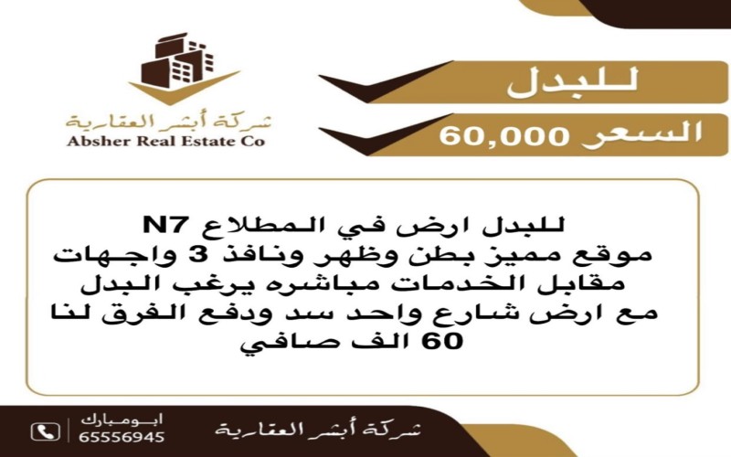 للبدل ارض في المطلاع موقع مميز N7 بطن وظهر ونافذ 3 واجهات رتداد 15 , 9 , 6 مقابل الخدمات مباشره رواق يرغب فلبدل مع ارض سد شارع واحد ودفع الفرق 60 الف صافي